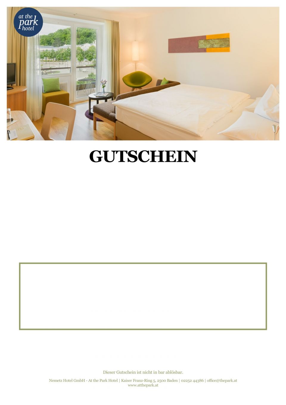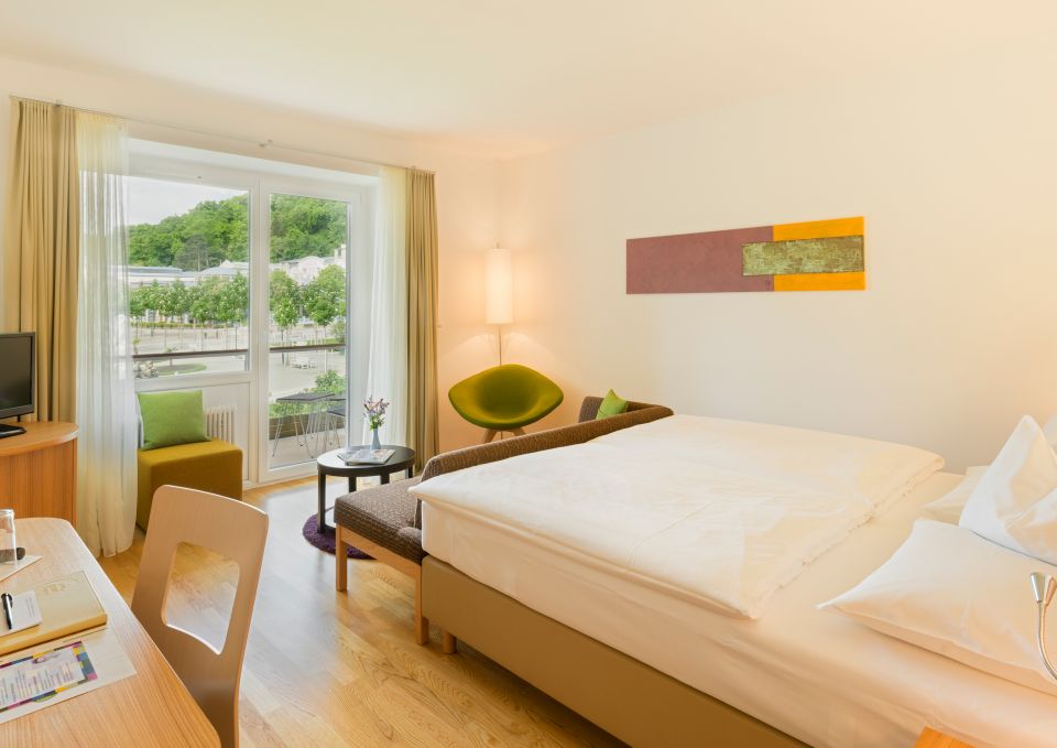 Das großzügige Zimmer bietet ca. 30 m², ein modernes Bad, getrenntes WC, Holzboden, WLAN, Kabel-TV sowie einen Balkon mit Blick auf den Kurpark und das Casino.